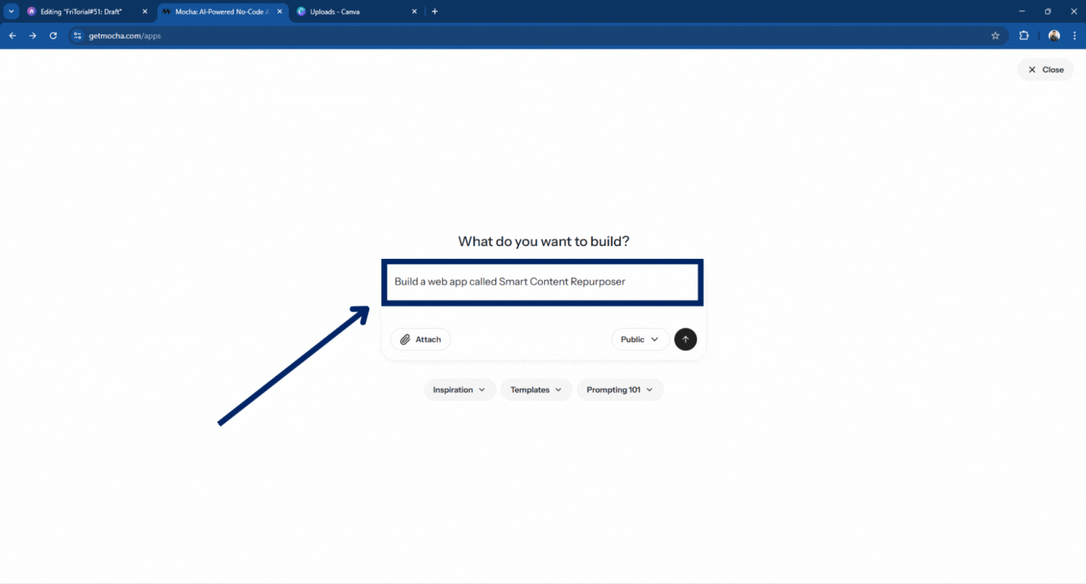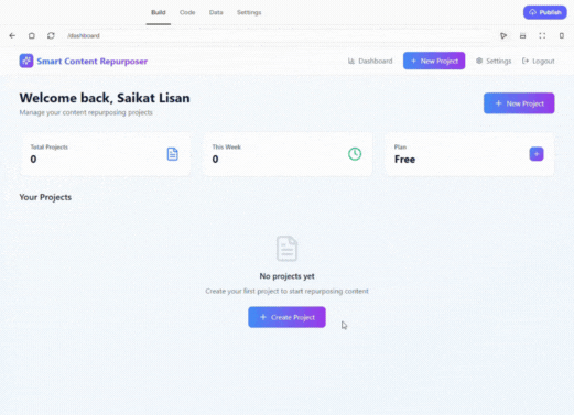 Type your app idea — for example, “Build a web app called Smart Content Repurposer.”