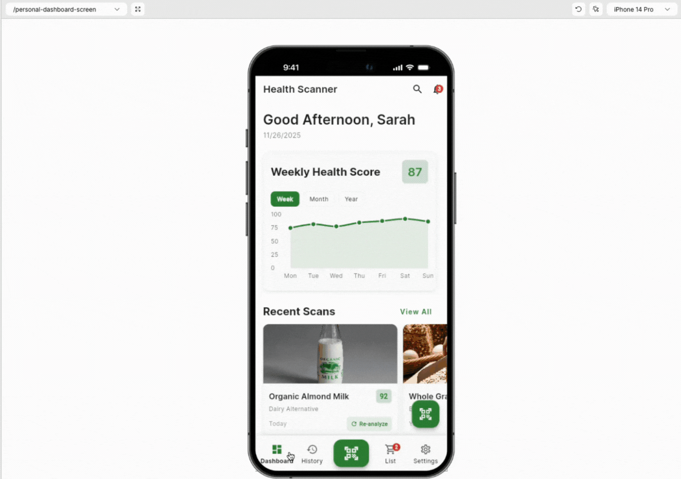 The app should generate a clear "Safety Verdict" for each dietary profile (e.g., “Safe for vegans,” “Not safe for Jain,” “Moderate risk for diabetics,” etc.) and suggest cleaner or safer alternative brands. Include an ingredient-by-ingredient breakdown, allergen alerts, sugar/carb load analysis, preservative rating, and an overall health score. If the product contains harmful additives or misleading claims, the AI should explain these red flags and provide healthier substitutions.