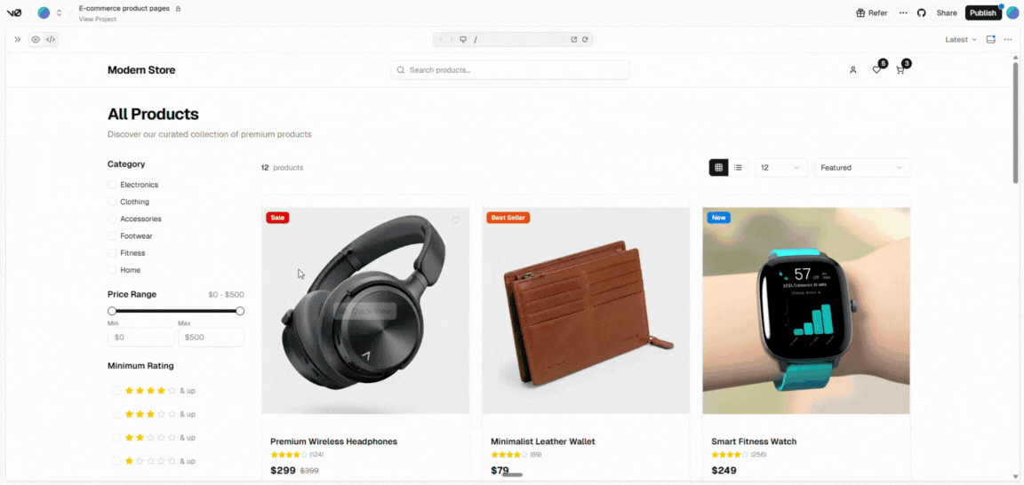 Build an e-commerce product listing page with faceted filters (category, price, rating), sort dropdown, product grid cards, and quick view modal. Also generate a product detail page: image gallery, variants, reviews, add-to-cart, related products. Responsive, accessible, and fast-looking skeleton loading.