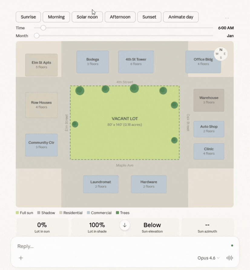 Claude generates an interactive sun and shadow simulator for the lot, with controls for time of day and month, plus a visual map showing where sunlight and shade fall across the space.