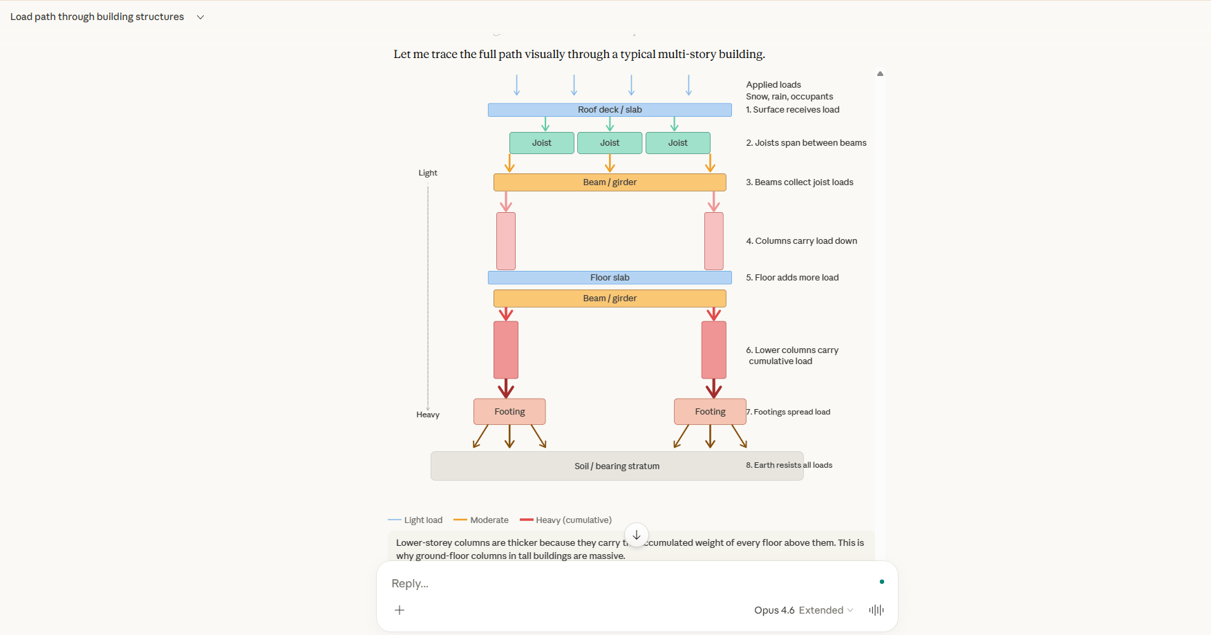 Claude generates a visual load path diagram showing how weight moves through a building structure.