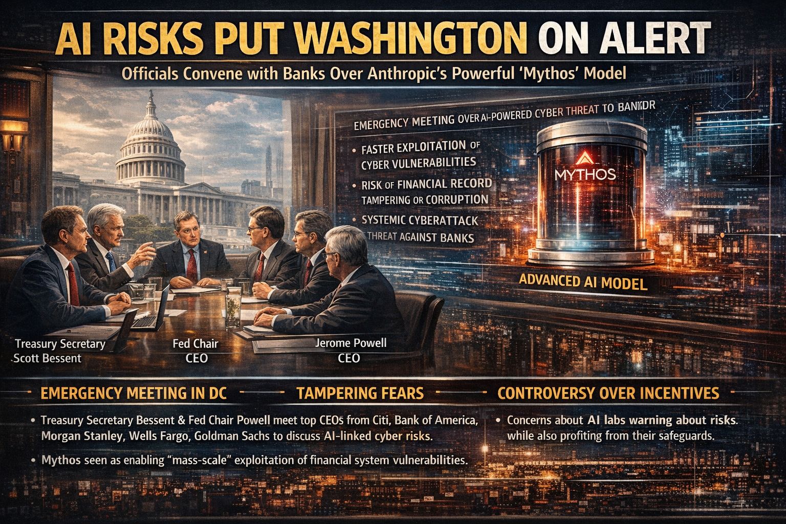 Emergency meeting in DC: Treasury Secretary Scott Bessent and Fed Chair Jerome Powell reportedly summoned CEOs from Citi, Bank of America, Morgan Stanley, Wells Fargo, and Goldman Sachs to discuss AI-linked systemic cyber risk.