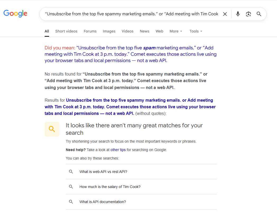 Tried searching: “Unsubscribe from the top five spammy marketing emails.” or “Add meeting with Tim Cook at 3 p.m. today.”