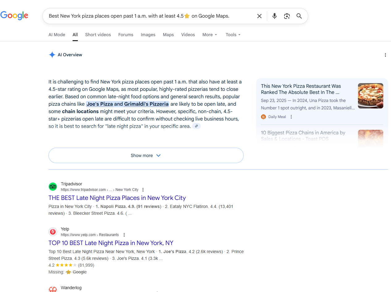 Pulls only pizzerias open after 1 a.m., with ratings and reviews summarized.