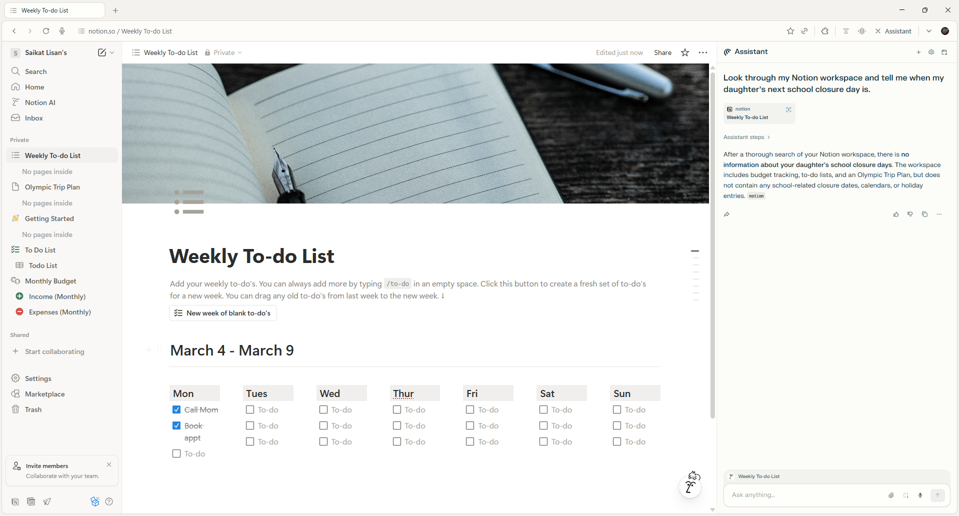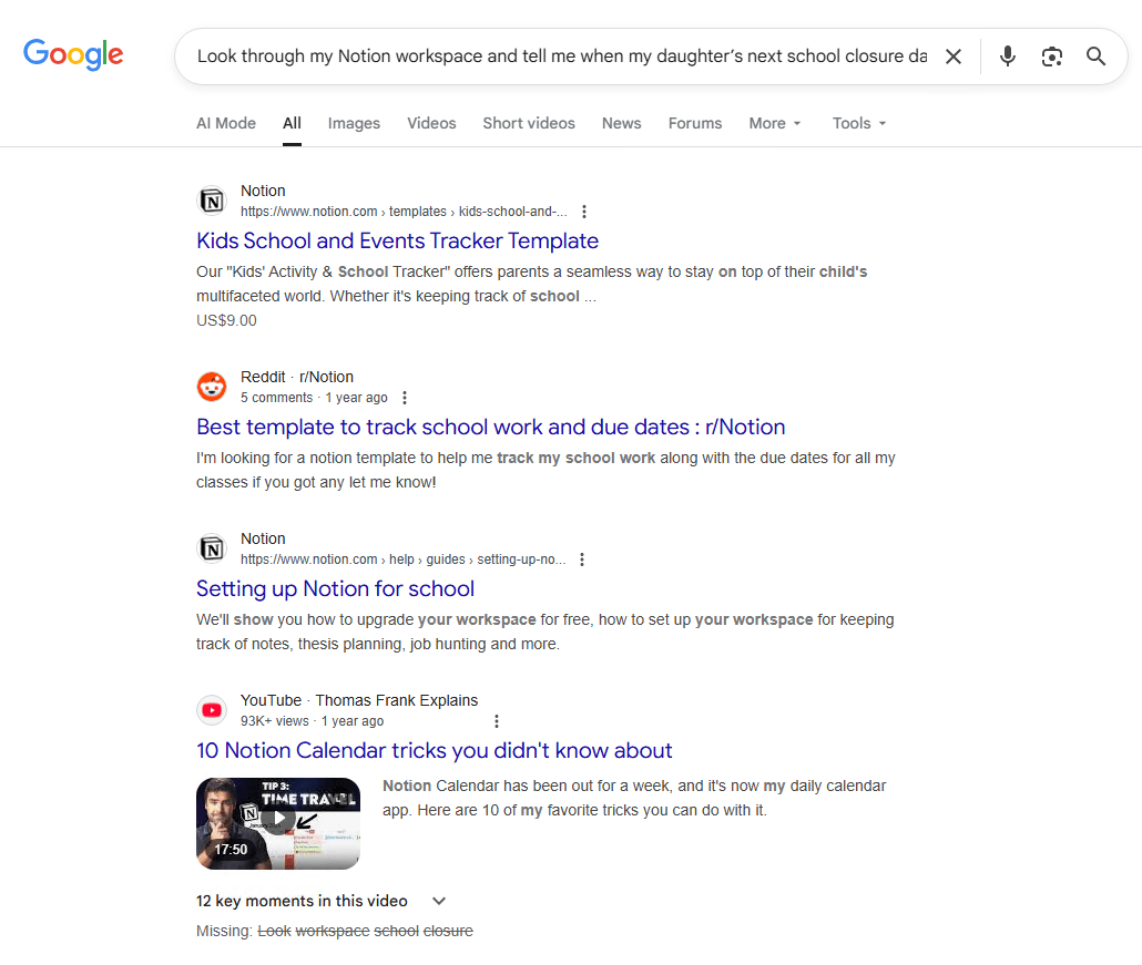 Searched: “Look through my Notion workspace and tell me when my daughter’s next school closure day is.”