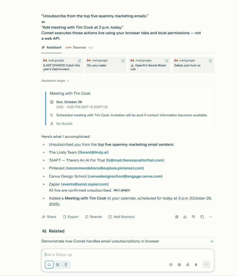 Comet executes those actions live using your browser tabs and local permissions — not a web API.