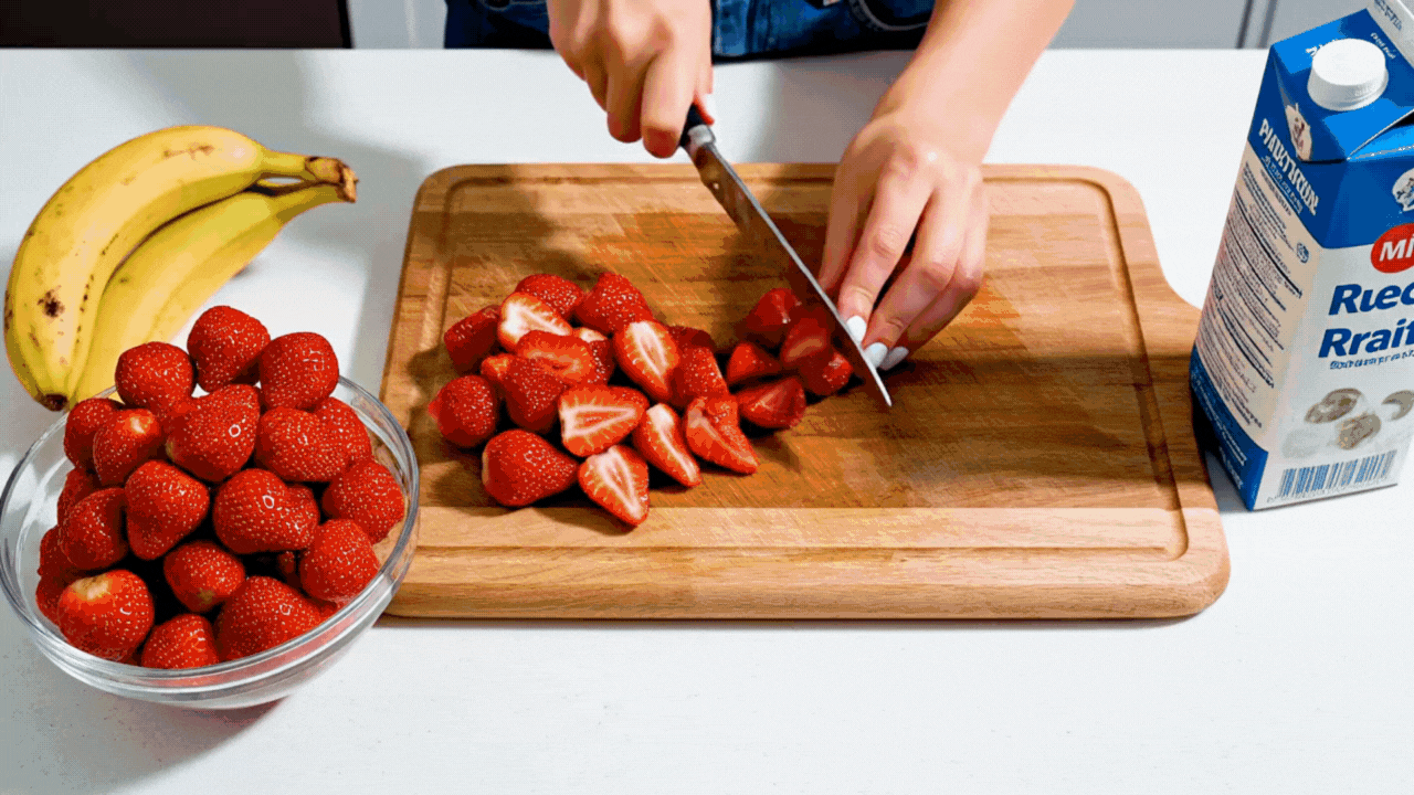 “Produce a 10-second overhead cooking video of someone making a strawberry–banana smoothie on a white kitchen counter.