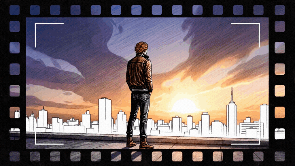 – Panel 1: Wide shot of a character standing on a rooftop at sunset