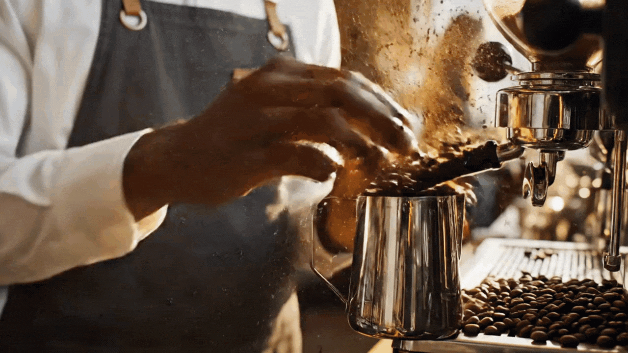 Close-up: A barista’s hands grinding fresh coffee beans, with soft morning light hitting the counter.