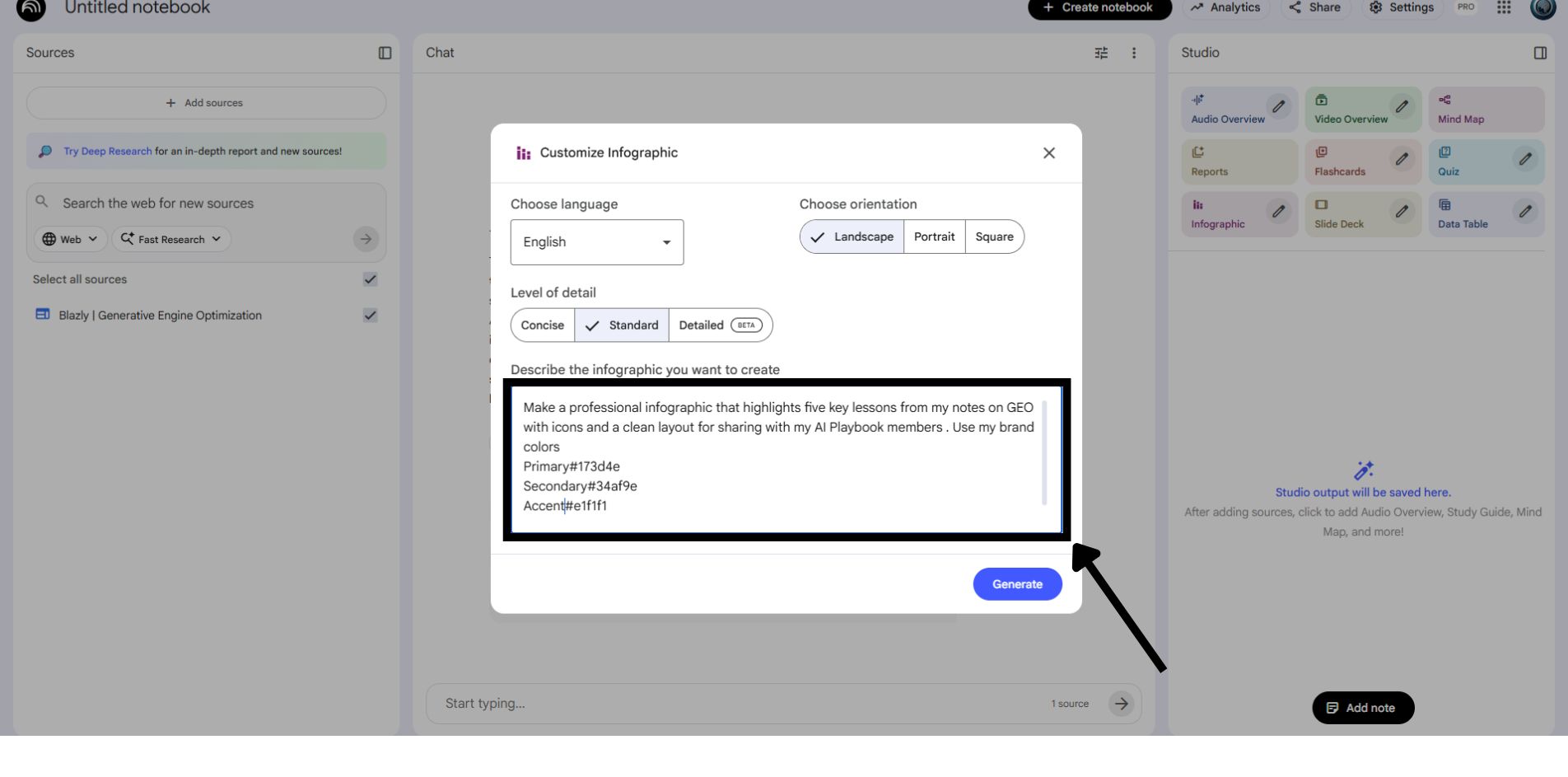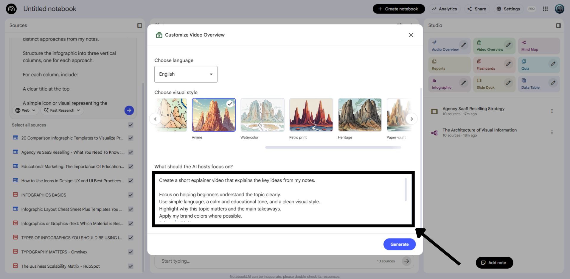 This is where you tell NotebookLM what the video should explain and who it’s for.
