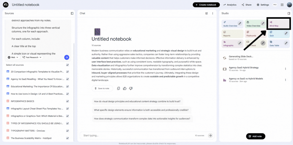 NotebookLM will automatically analyze your research and generate a structured, visual map of the topic.