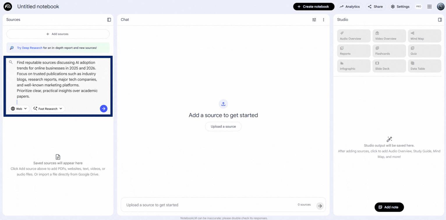 Find reputable sources discussing AI adoption trends for online businesses in 2025 and 2026. Focus on trusted publications such as industry blogs, research reports, major tech companies, and well-known marketing platforms. Prioritize clear, practical insights over academic papers.After submitting the prompt, NotebookLM quickly scans the web and returns a curated list of sources.