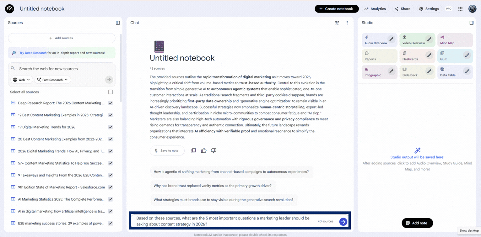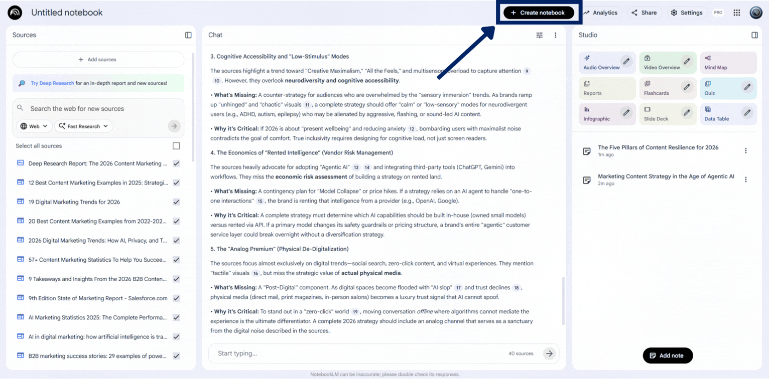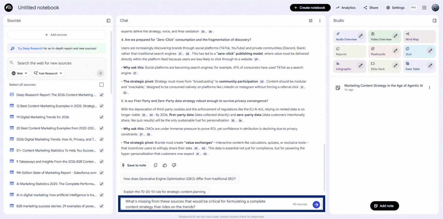 NotebookLM will then evaluate the quality and coverage of your current sources, point out blind spots, and highlight important areas that deserve deeper research. This helps you avoid building strategies on incomplete information and surfaces angles you might not have considered on your own.