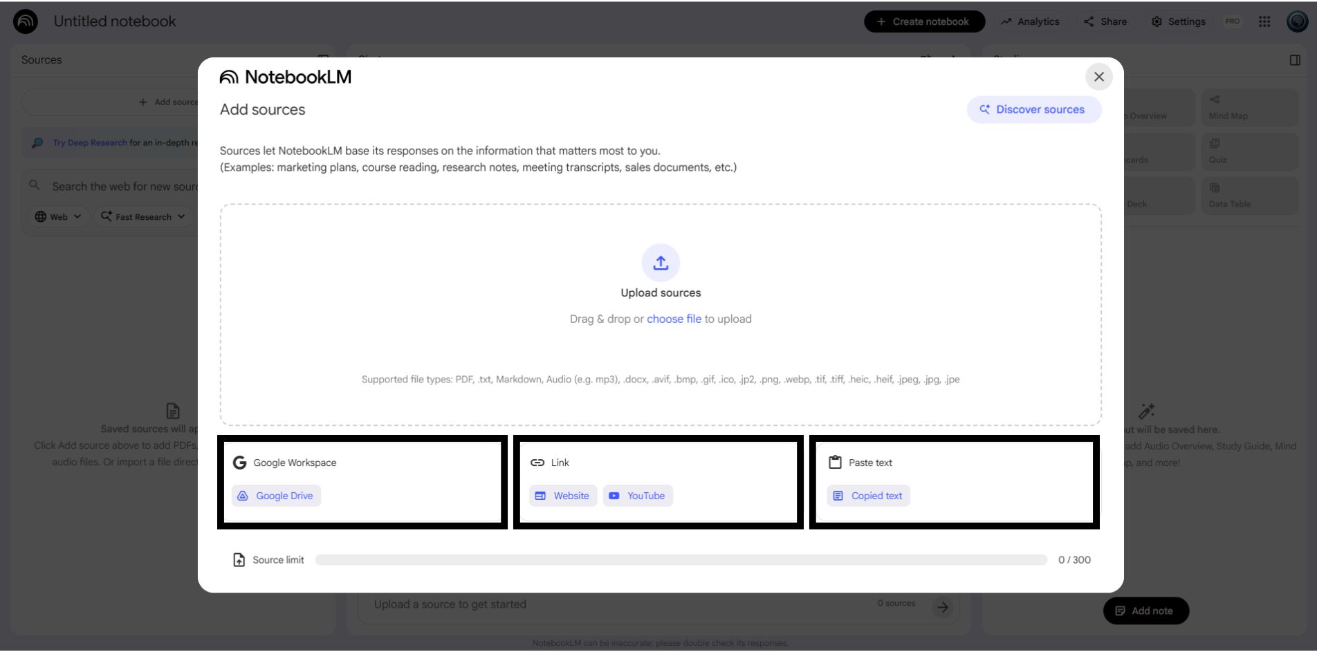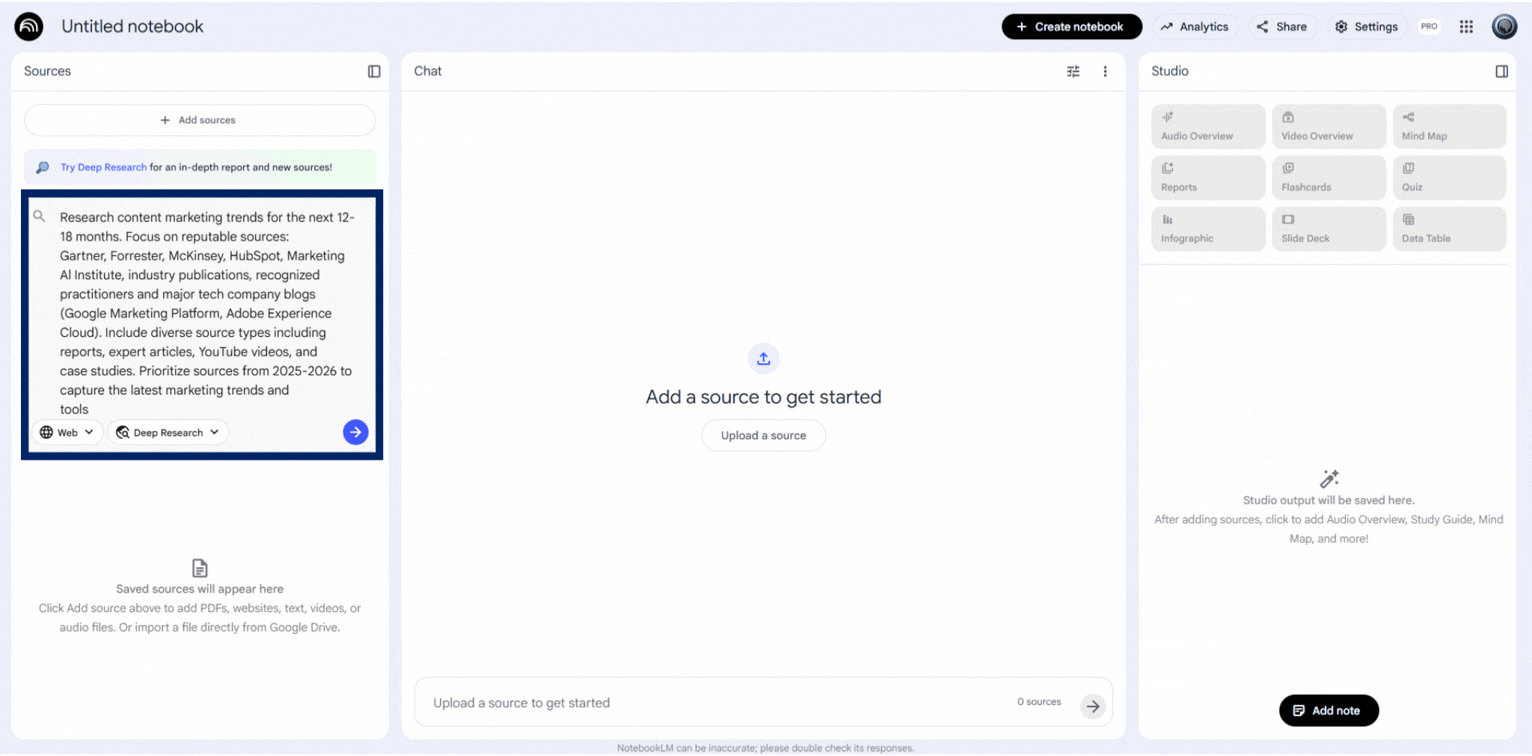 If you don’t already have sources of your own, this is where NotebookLM becomes extremely powerful. Instead of collecting reports, articles, or PDFs manually, you can let NotebookLM generate high-quality sources for you and turn them into a structured research foundation.