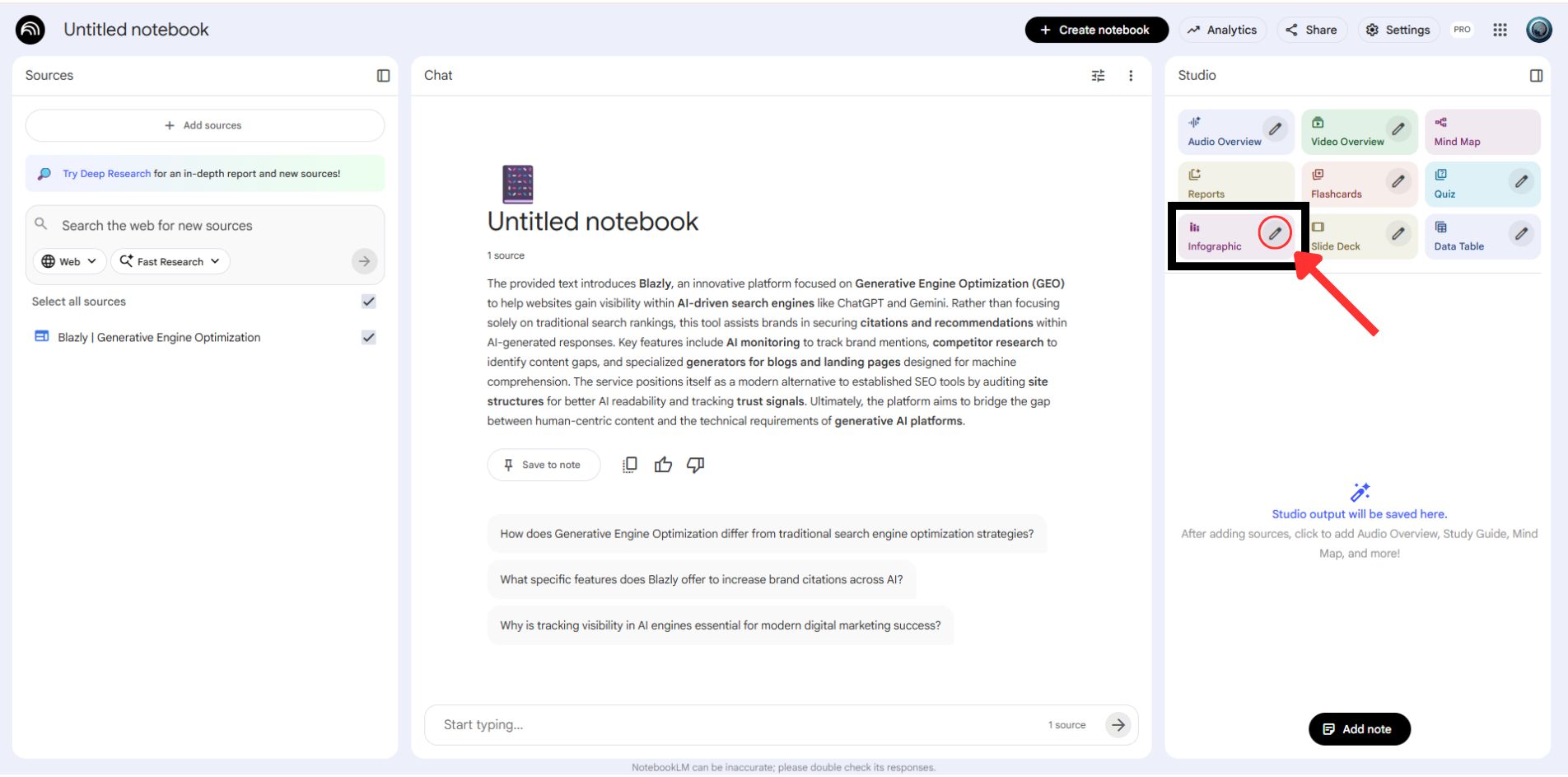 Now look to the right-hand panel and click Infographic.To improve the output, click the pencil icon next to the infographic option.