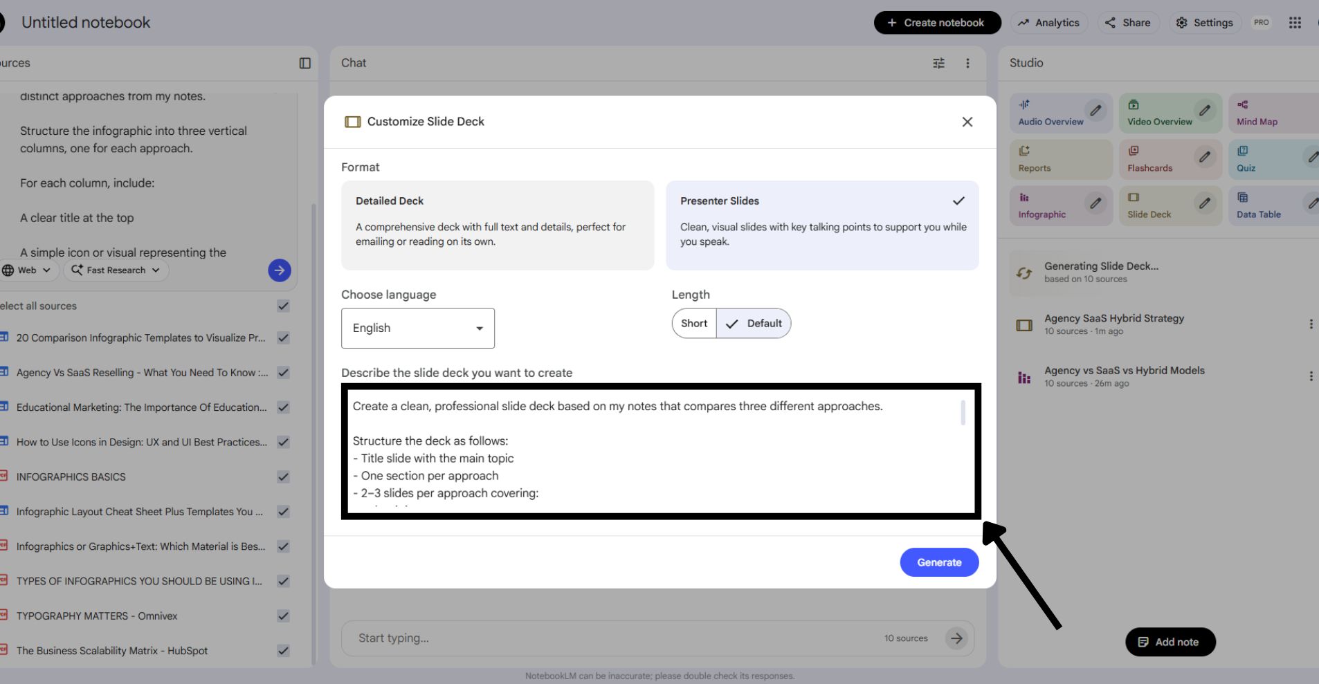 Now focus on the “Describe the slide deck you want to create” field this is where the quality of the output is decided.