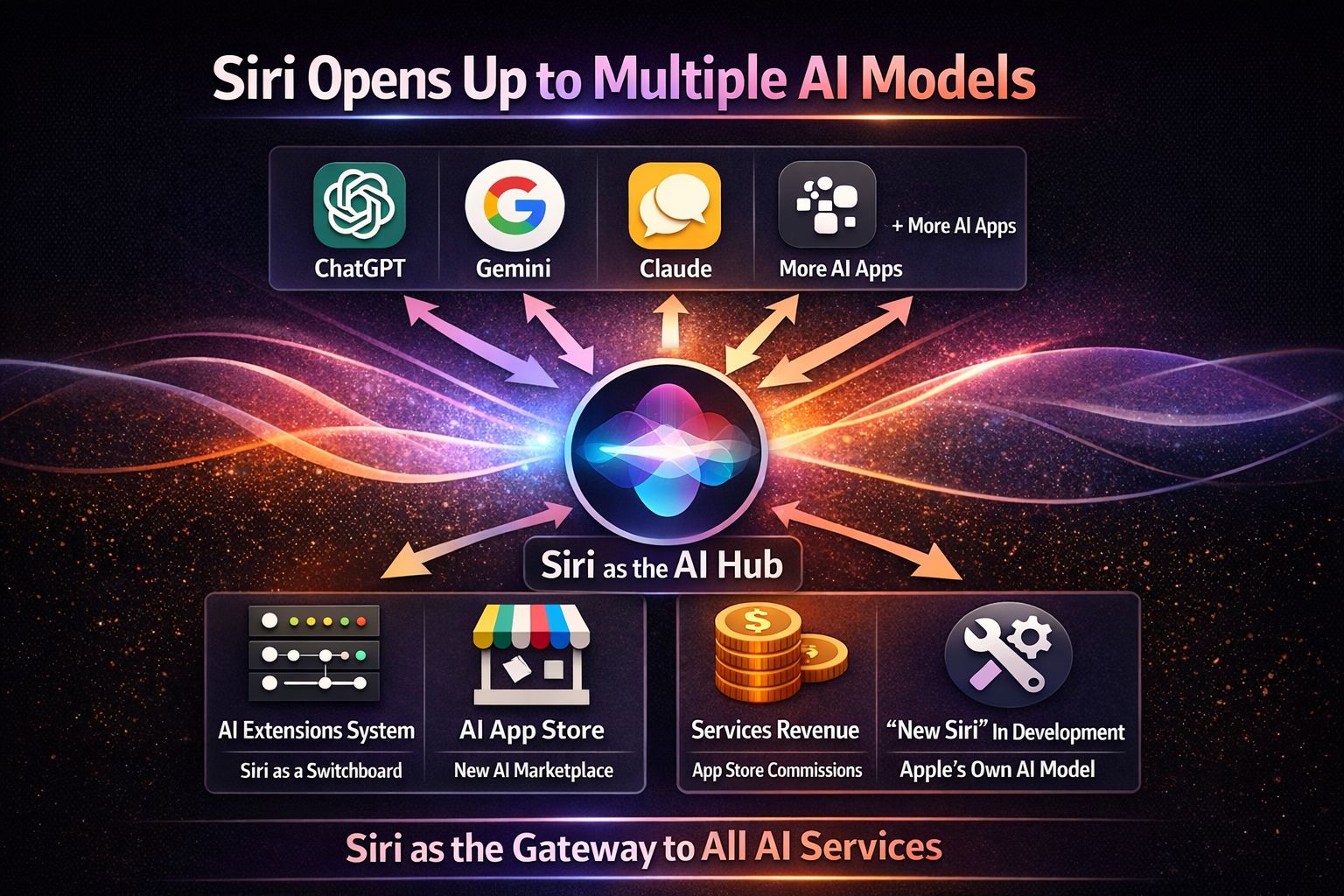 Siri becomes a switchboard: A new Extensions system would let installed AI apps work inside Siri across iOS, iPadOS, and macOS, instead of relying on one exclusive partner.